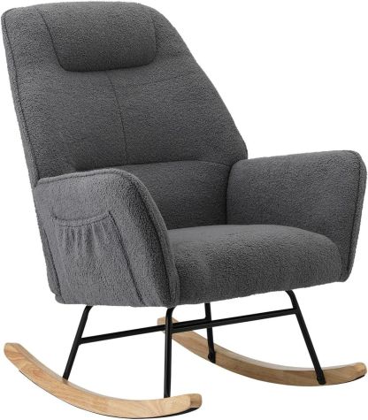 OIKITURE Sherpa Upholstered Rocking Chair, Accent Armchair with Rubberwood Rocking Base, Side Pocket, Anti-Slip Protective Base Mat, Nursing Chairs for Bedroom, Living Room, 52x79x94cm, Grey
